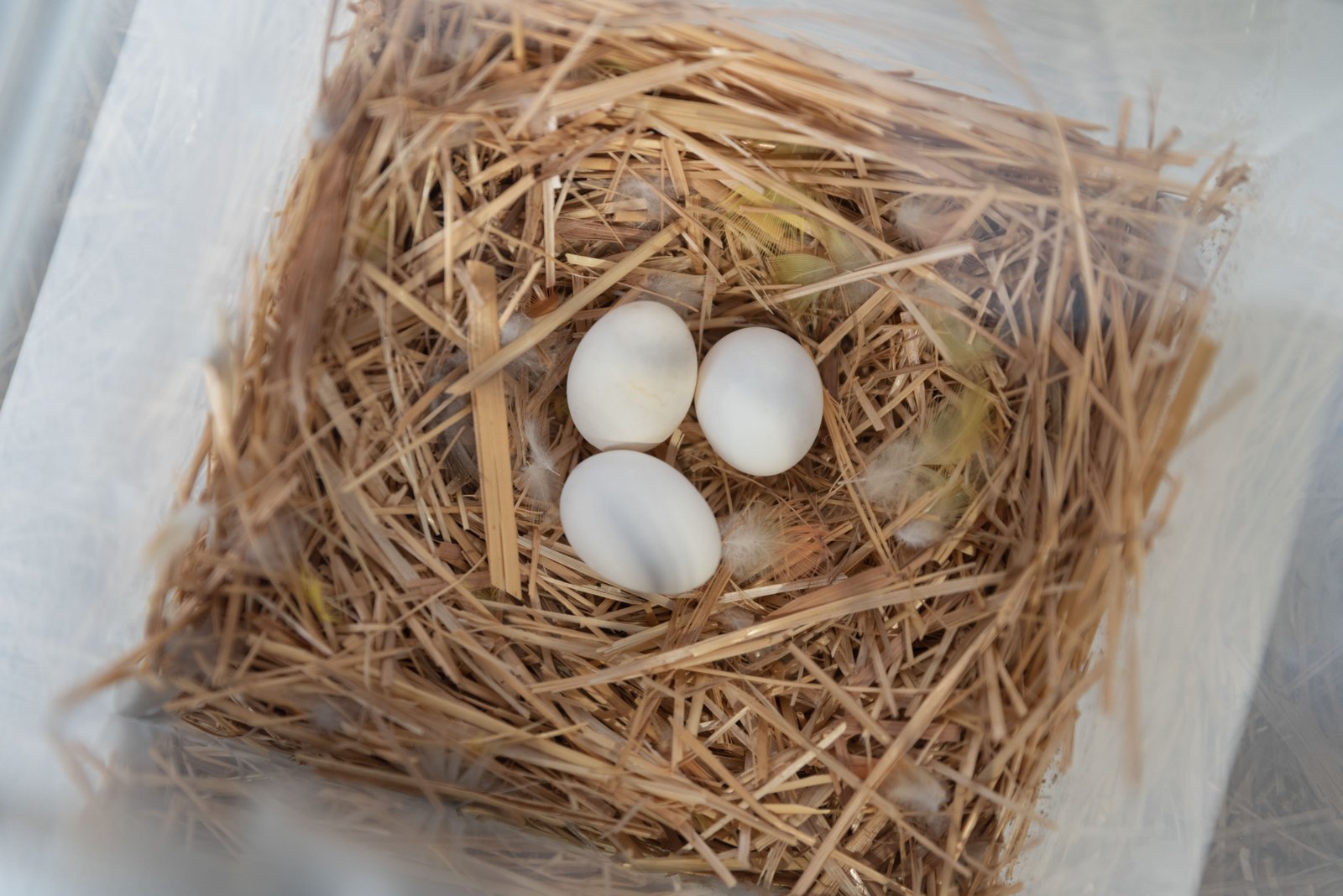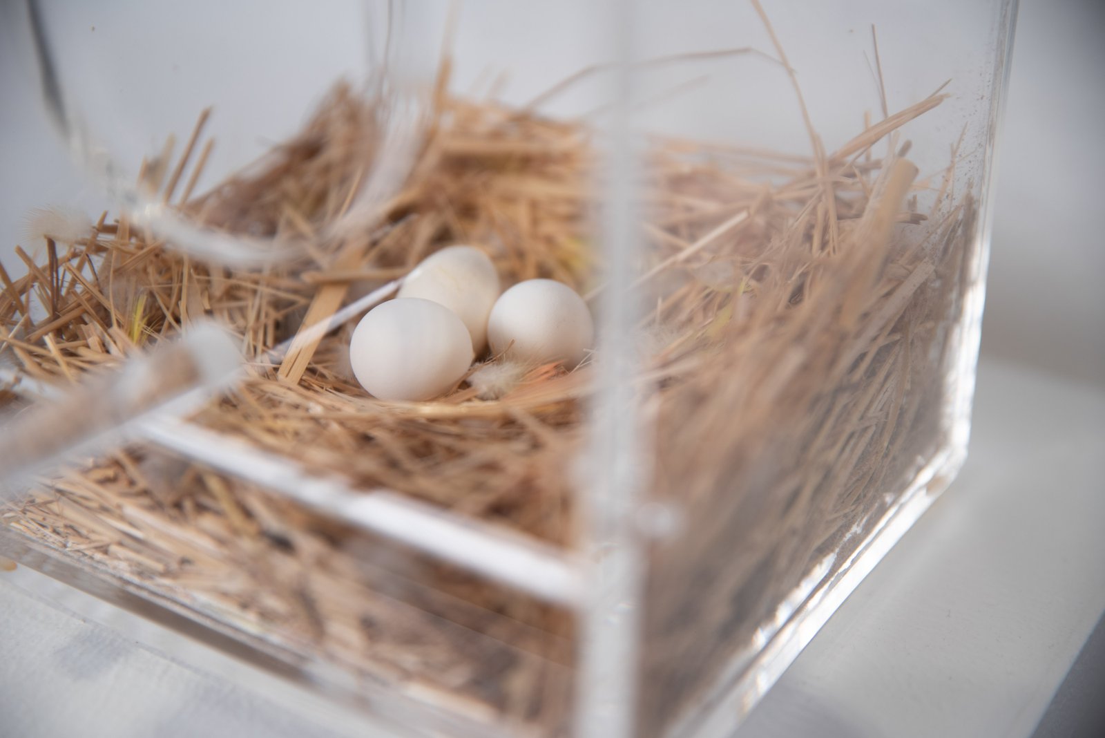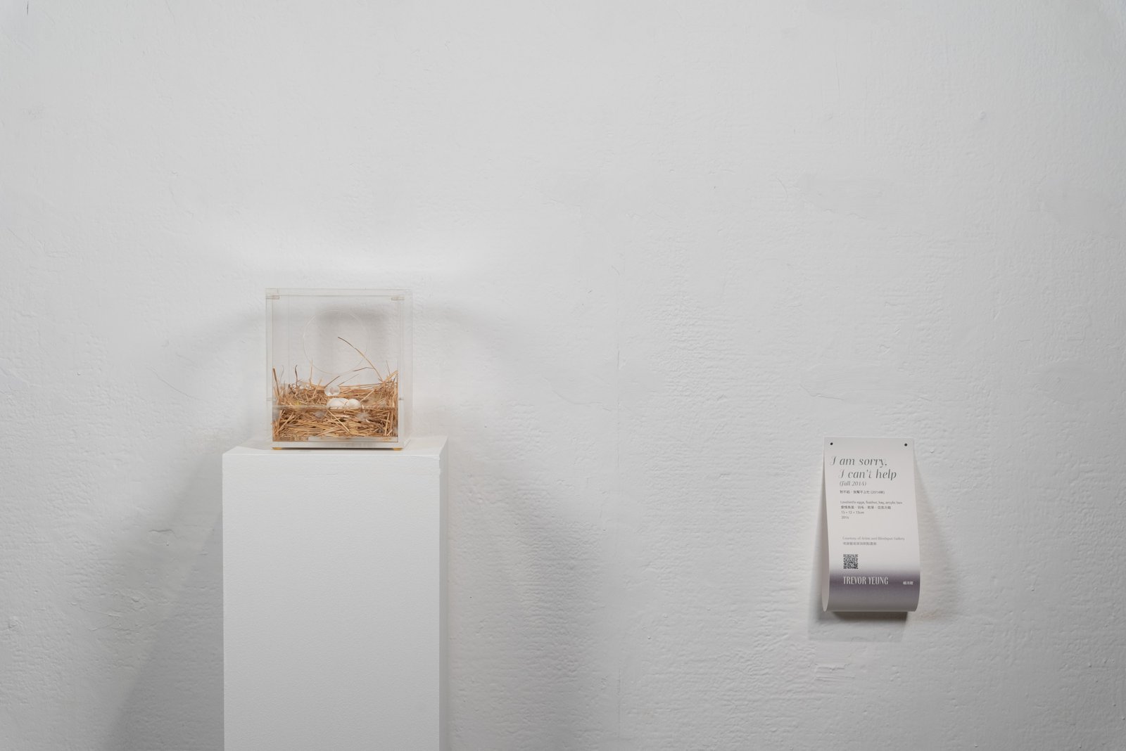 The work is about the understanding of the imperfection of a relationship. And there was two perspectives, to the lovers themselves and the expectation of the others. The unhatched eggs were from the artist’s loverbirds, Shyboy and Moon. The nest was built by Moon.